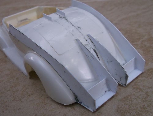 Here I start building up the trunk with sheet plastic to simulate a 58 Tbird rear.