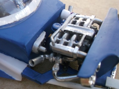 I built a front grille out of sheet plastic. The front springs are real springs.