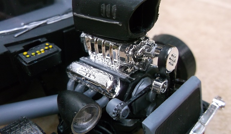 I removed the front fenders to expose the engine, which is a blown Ford Cobra 427. I decided