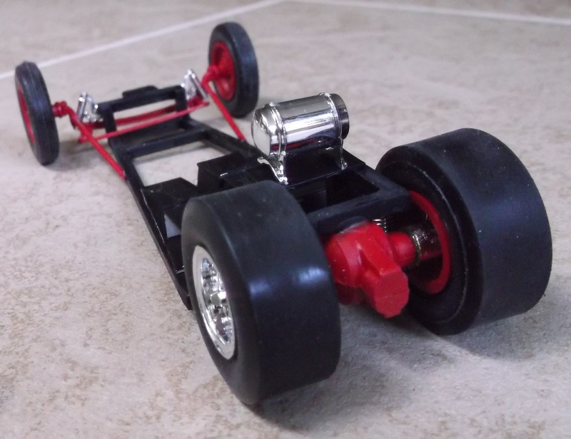 The frame and rear suspension is custom built. The exhaust pipes are speaker wire. The exhaust collectors are plastic straws.
