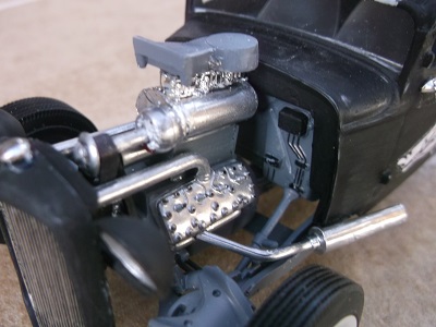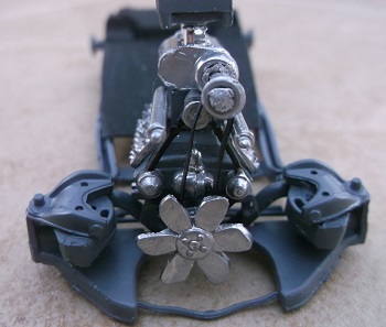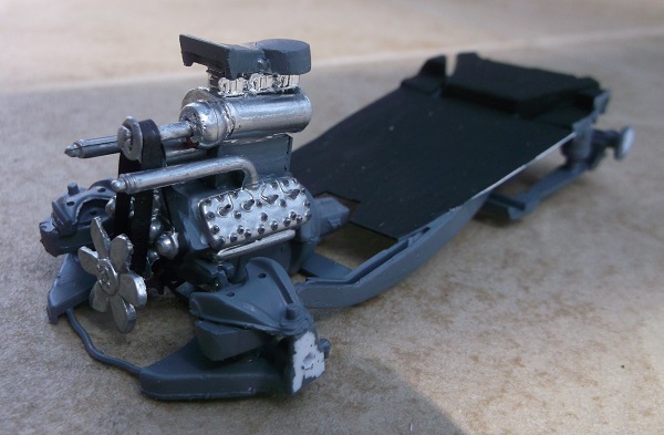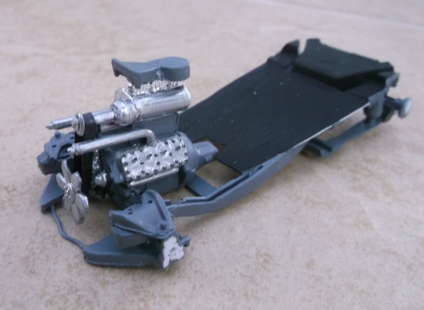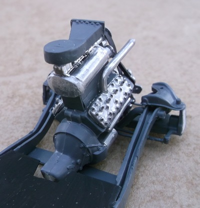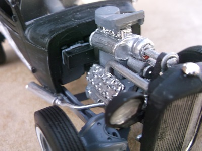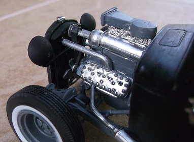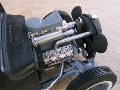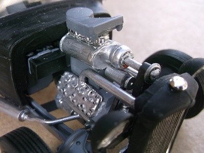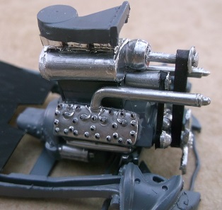 The flathead engine has a home built blower made from plastic straws and a necklace bead.