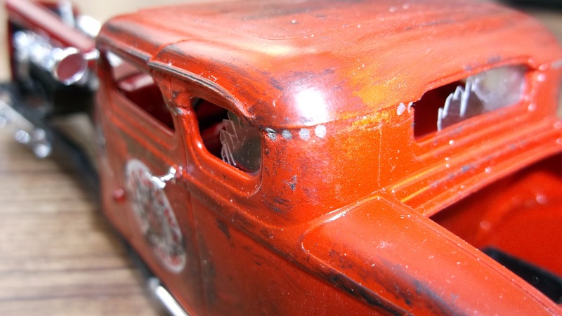 The frame is hand built from plastic rods. I aged the 32 Ford body by hitting it